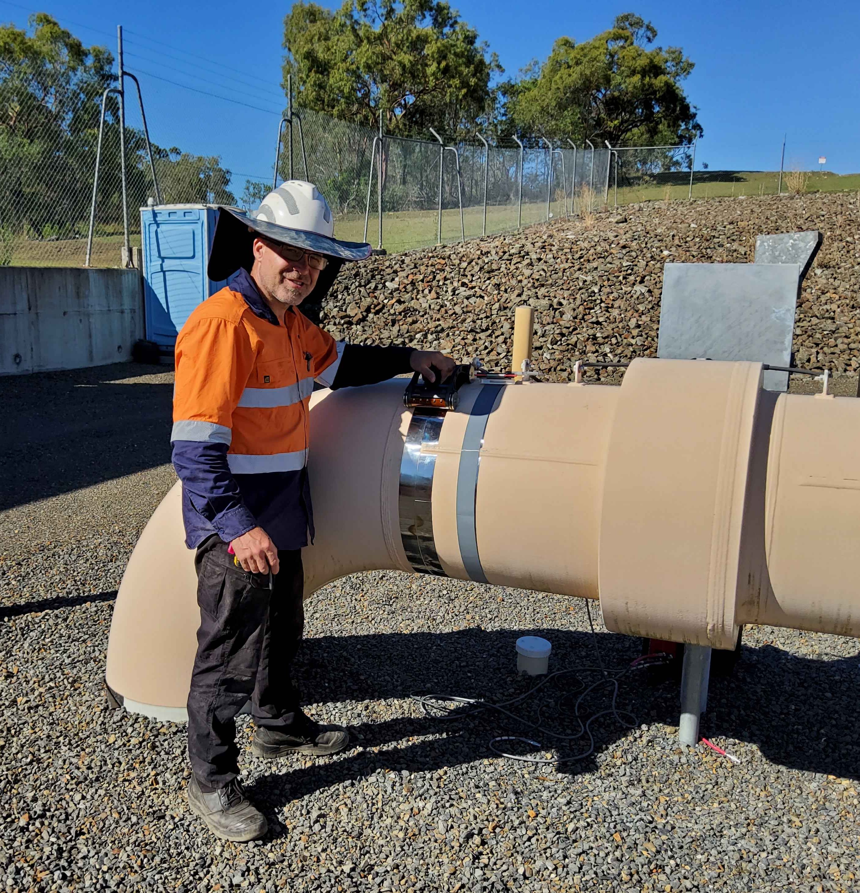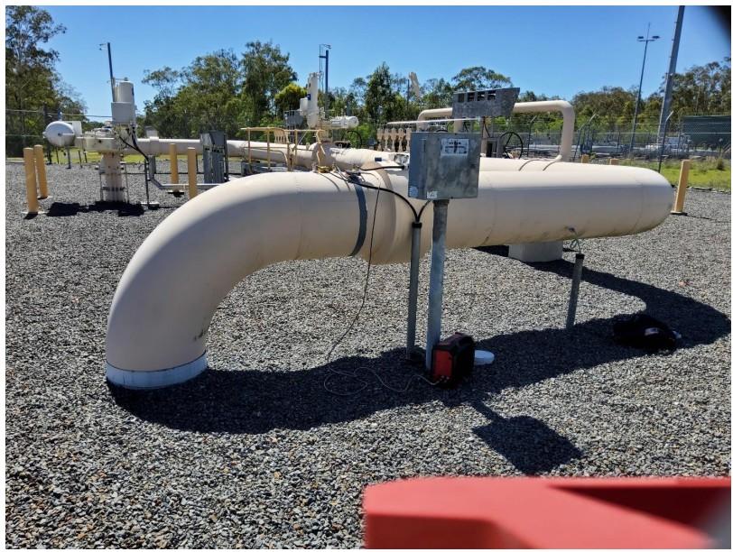 The test was conducted on 10" and 24" NPS (Schedule 60) carbon steel gas risers located in remote Central Queensland. These ground-penetrating pipes typically reach a depth of 3 m, where they meet a T-joint at a manifold or a 40-inch main gas line. While these risers often experience external corrosion between the ground line and the underground manifold, they are not subject to internal corrosion.