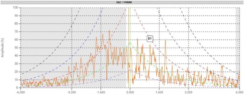 Typically, two or more spool welds are used as reference reflectors to calculate the DAC curve. In this instance, the first weld is located in close proximity to the initial pulse. The second weld is clearly visible, though it appears as a broadened signal (spanning from 2.2 m to 2.5 m) due to the differing path lengths around the 90-degree elbow.