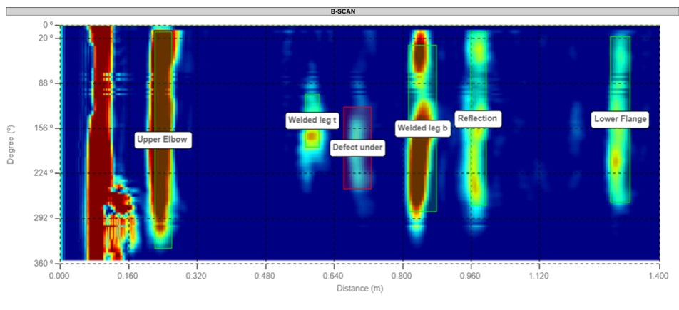 The inspection clearly differentiated between the geometric reflections from the elbow and trunnion welds and the non-geometric signal indicative of a defect. The MS-Strip technology significantly reduced the required inspection time by demonstrating reliable results and optimal coupling without the need for additional surface preparation on the painted pipe or a time-consuming setup.
